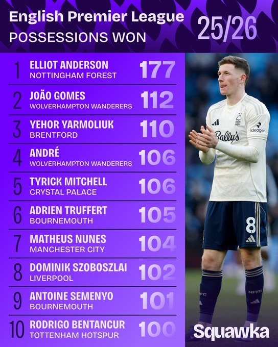 1月10日讯 数据机构squawka统计了本赛季英超赢得球权情况,诺丁汉森林中场埃利奥特·安德森独自领跑。